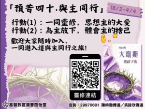 「預苦期」是紀念主耶穌在曠野四十天禁食禱告、為十架受苦作預備的日子,也是教會一同學習讀經、禱告、克己、悔改、親近主的節期。
